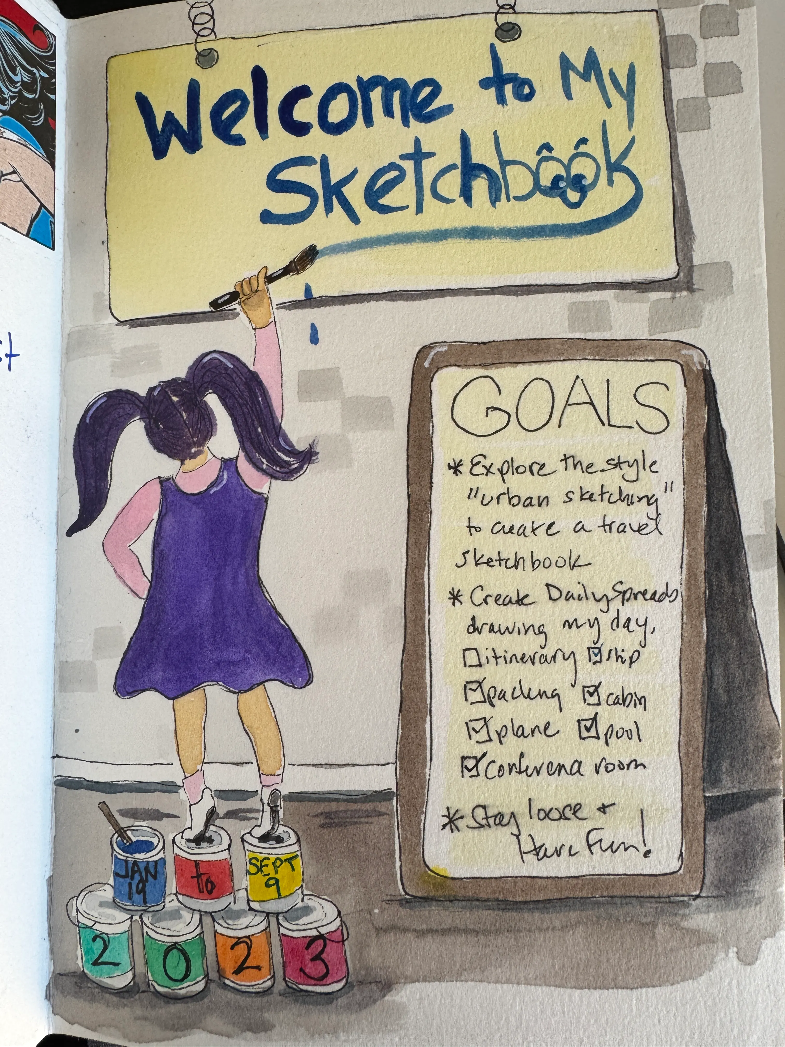I was going on a cruise, and this sketchbook would be my first travel sketchbook as well as first urban sketching experiences. So I brought Lulu along on this first page, as a reminder to not take myself too seriously.